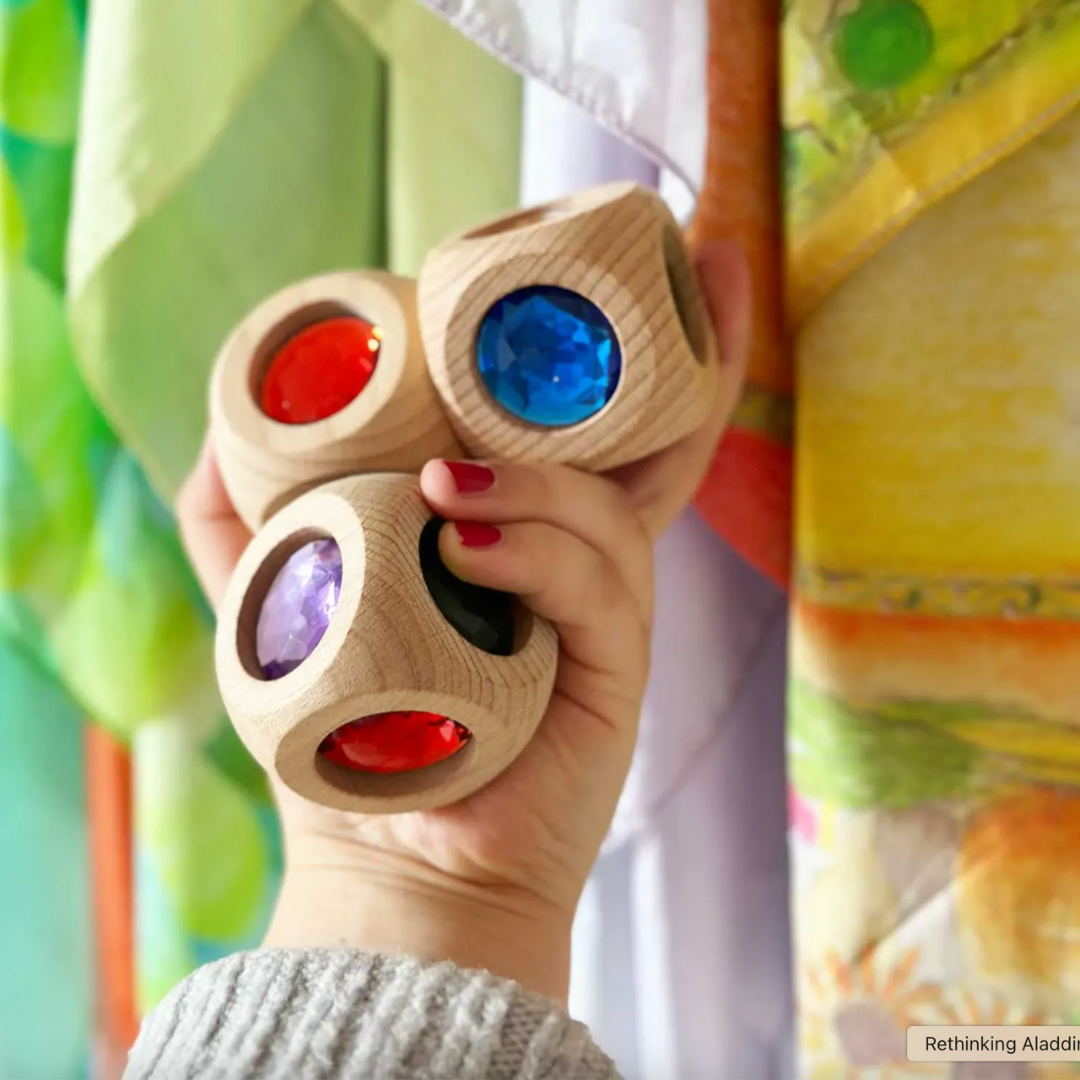 Add a touch of sparkle and sensory delight to your child’s play with the Bauspiel Magic Cube. This beautiful solid-wood cube is sculpted with gentle curves on every side and adorned with six radiant acrylic gemstones, one on each face. Its jewel-like colors catch the light, making it a captivating piece for open-ended play, sensory exploration, and building.