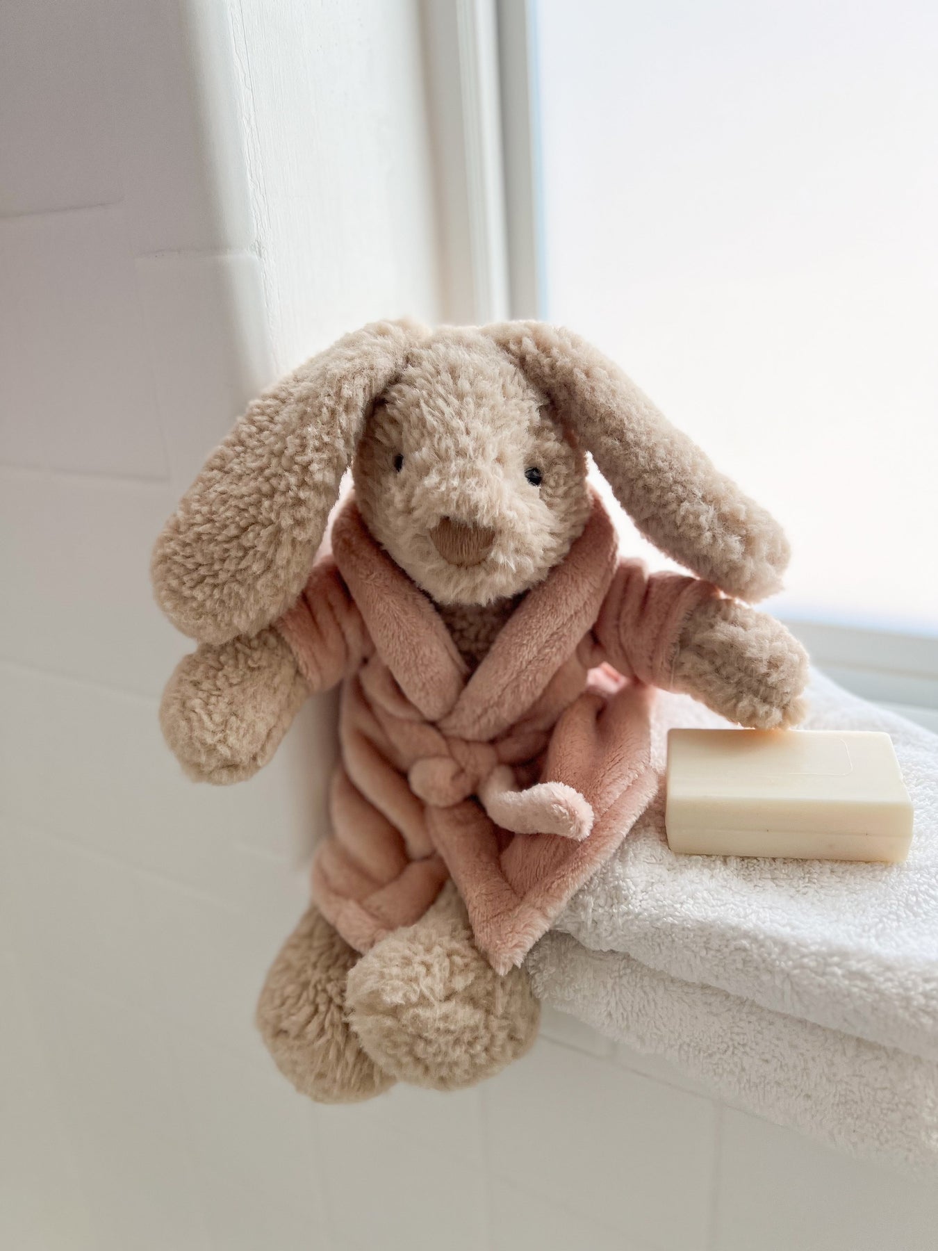 Introducing the Harlow Robe Bunny, your ultimate cuddle companion with a dash of charm! This sweet, sleepy bunny comes wrapped in a luxuriously soft velour bathrobe, ready to help you unwind after a long day. Imagine a cozy evening, just you and Harlow, flopping down together, its fluffy ears and snuggly robe magically melting your stress away. Harlow isn't just adorable, it's the master of chill vibes! So go ahead, shower this lovable bunny with affection, and watch as your worries hop away with your new, huggable friend!