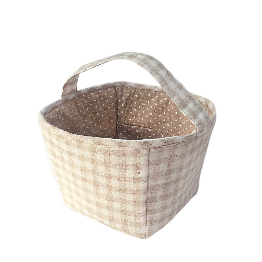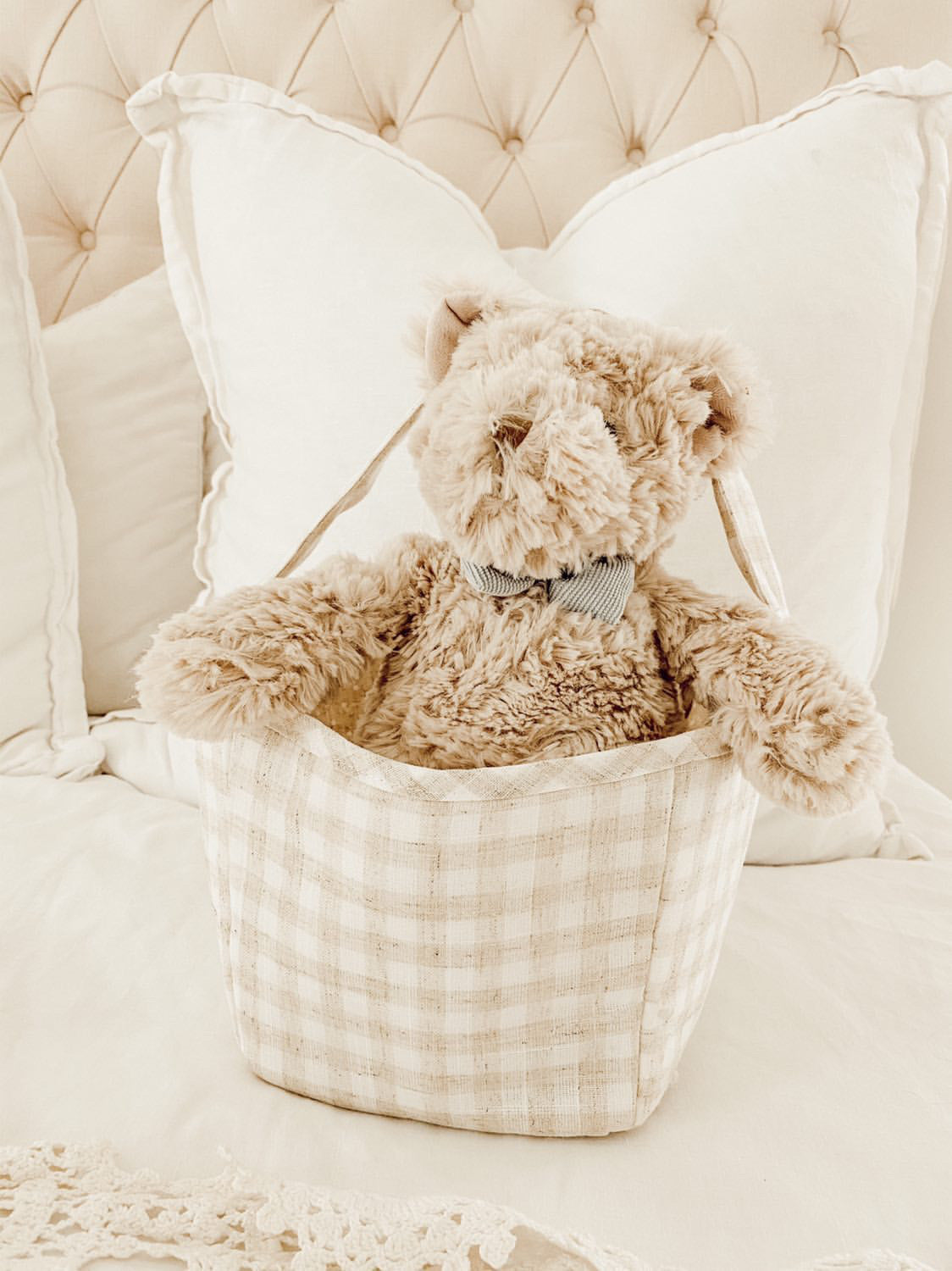 Charming storage....our little basket is perfect for gifting as well as storing nursery essentials, small toys, or attach our matching Baldwin Bear or Bunny Rabbit ornament for a unique Easter Basket! Neutral tan gingham and pin dot liner, this caddy coordinates with our nursery collection. Perfect for monogramming.