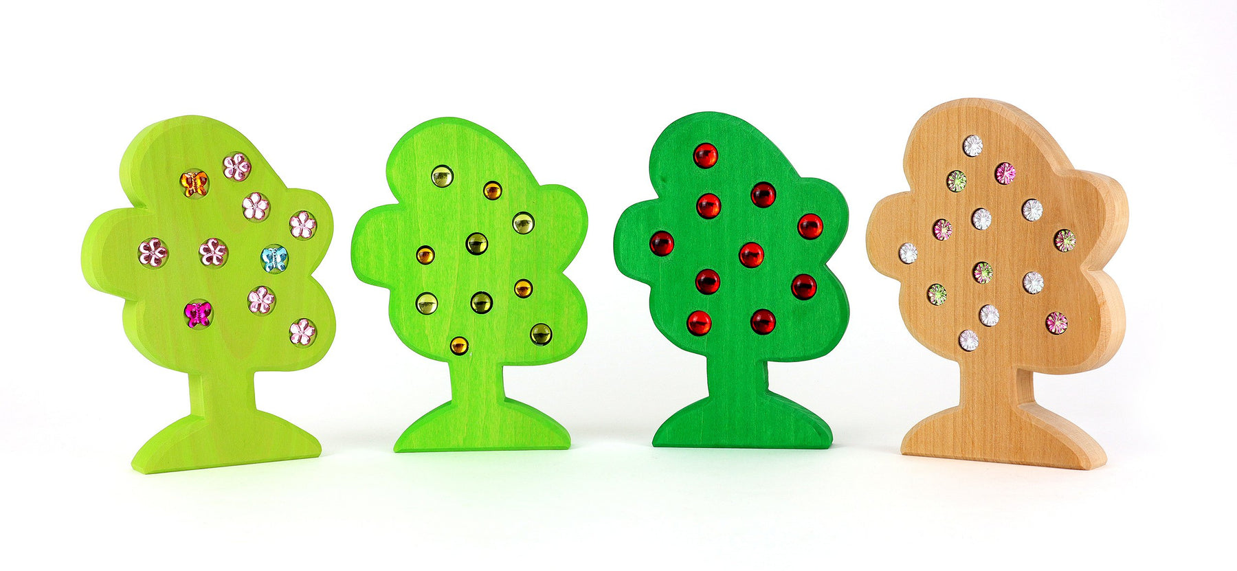 The Bauspiel Tree Set comes with four trees with sparkling stones on both sides; each tree represents one of the 4 seasons (spring: light green, summer: green, autumn: dark green, and winter: natural)