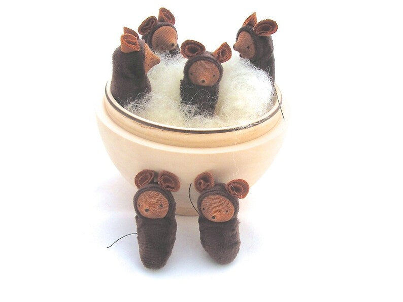 This sweet 2-inch tall mouse comes in brown or tan, hand-sewn with care from cotton knit fabric over a wooden base, complete with a tiny stitched tail. With its hand-drawn face and gentle expression, the Small Mouse makes a wonderful son or daughter, expanding the world of pretend play.