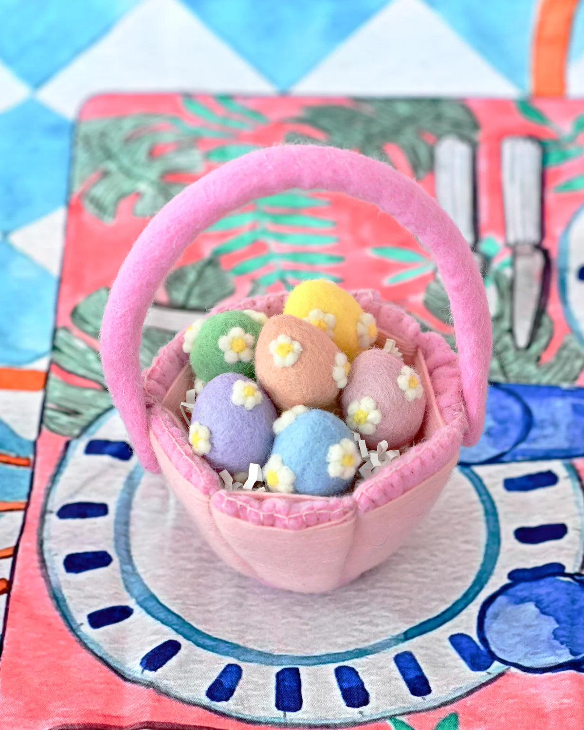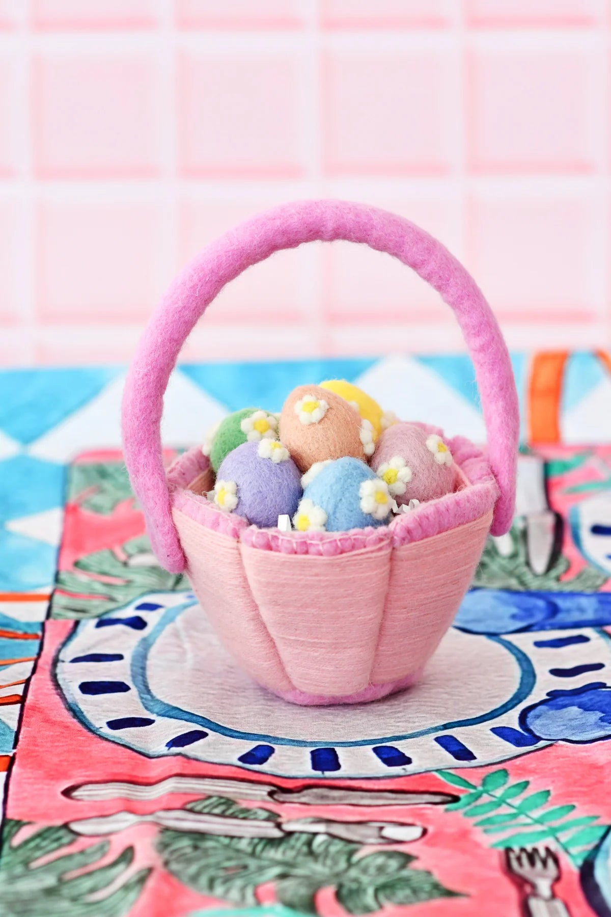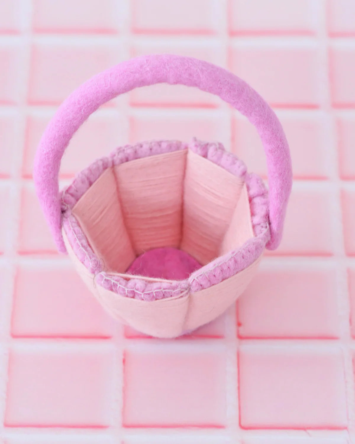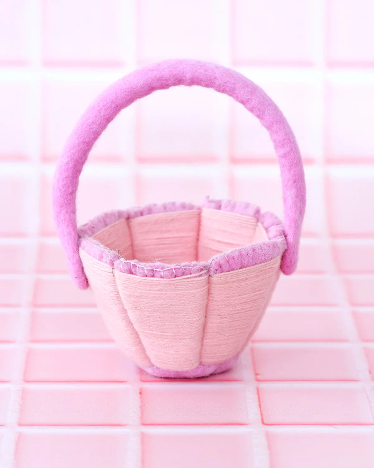 Hop into Easter fun with our Petite Pink Felt Easter Basket! This smaller basket is crafted from soft felt and features a charming string weave detail, adding texture and a handmade touch.