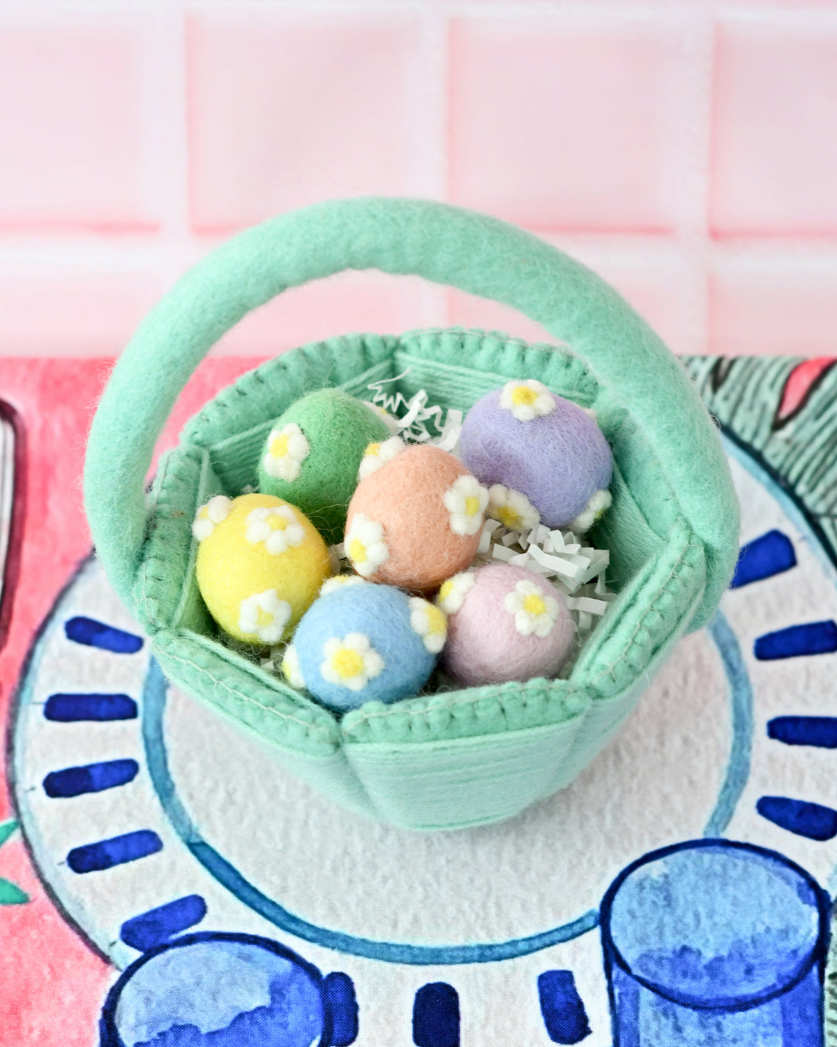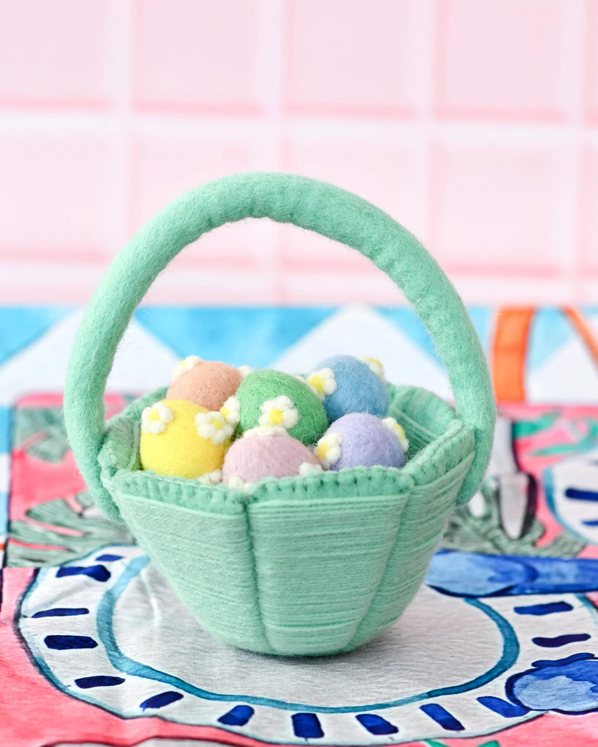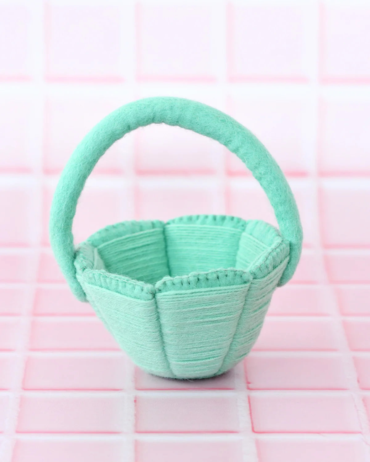 Hop into Easter fun with our Petite Teal Felt Easter Basket! This smaller basket is crafted from soft felt and features a charming string weave detail, adding texture and a handmade touch.