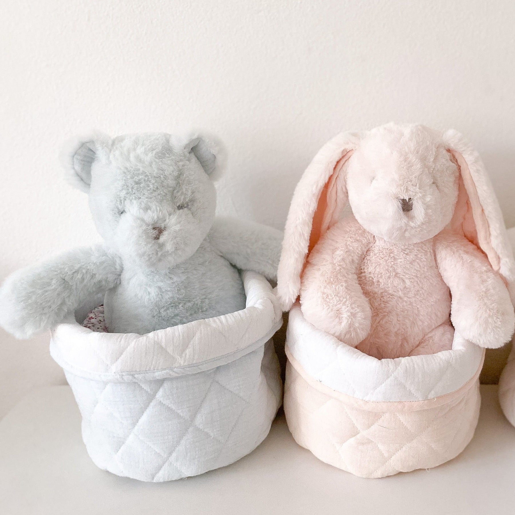 Aston Luxe Bear is made of the our signature luxe fabric, with soft cotton muslin feet and ear accents. He is made with the highest quality construction and its softness is unmatched. Perfect for baby showers and gifts. An heirloom keepsake for years to come.