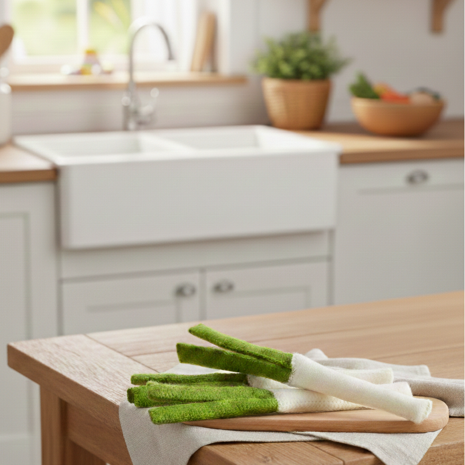 Add a fresh, farm-to-table favourite to your child’s play kitchen with this beautifully handcrafted Felt Vegetable Leek set. With their long green tops and detailed blanket stitching, these realistic felt leeks bring texture and authenticity to pretend markets, restaurants, and home kitchen play.
