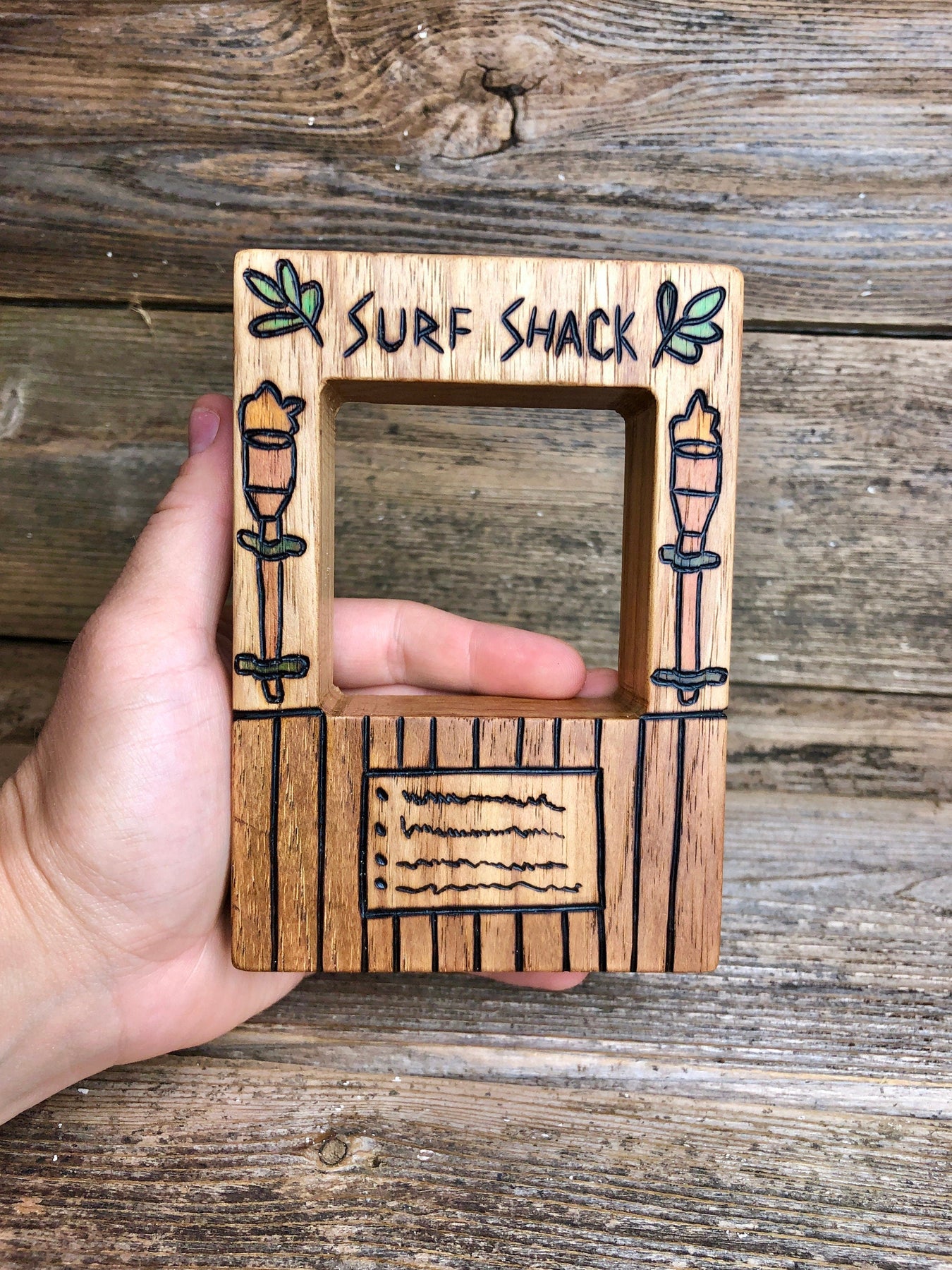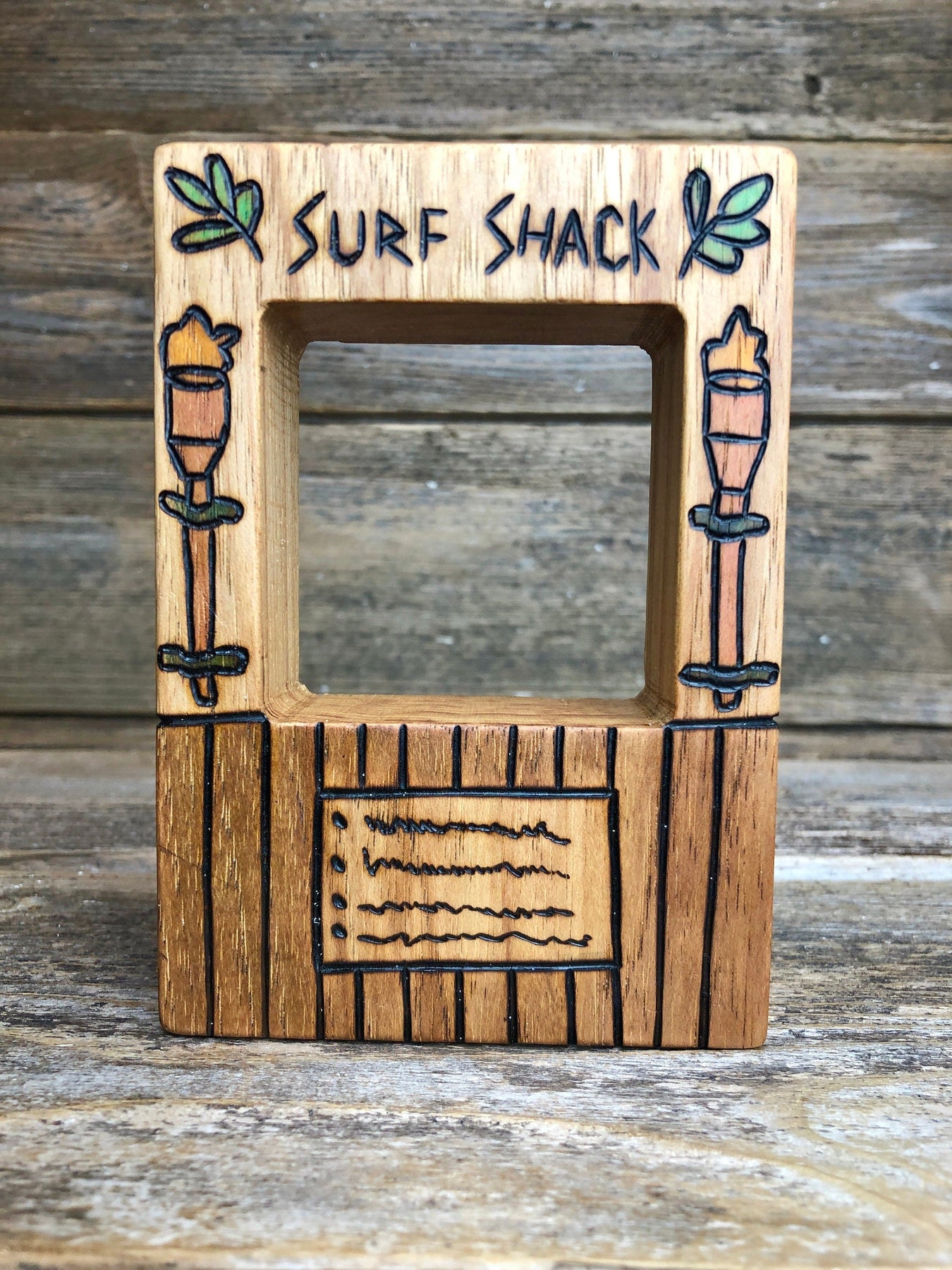 Surf Shack with Tiki Torches Dimensions: 5" Tall, 3.75" Wide, 1.25" Thick