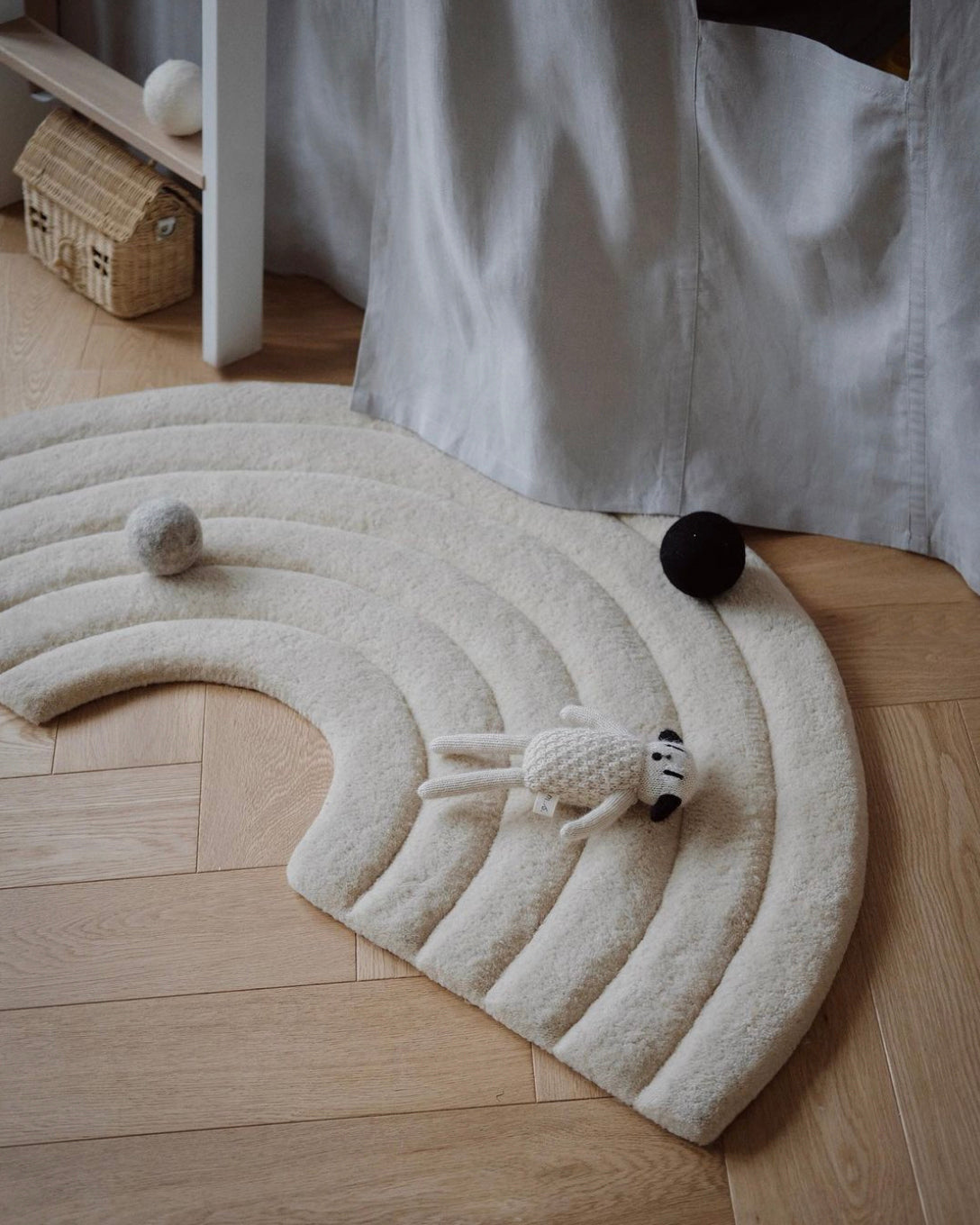 Decorate your children's room with the 3D textured Rainbow Rug Naturalmade of 100% New Zealand wool in a natural color. Each rainbow stroke is roundly cut and hand-carved to create a bubbly embossement. Kids love to touch it as it adds a sensory and fun element to the rug. A real treat for their feet.