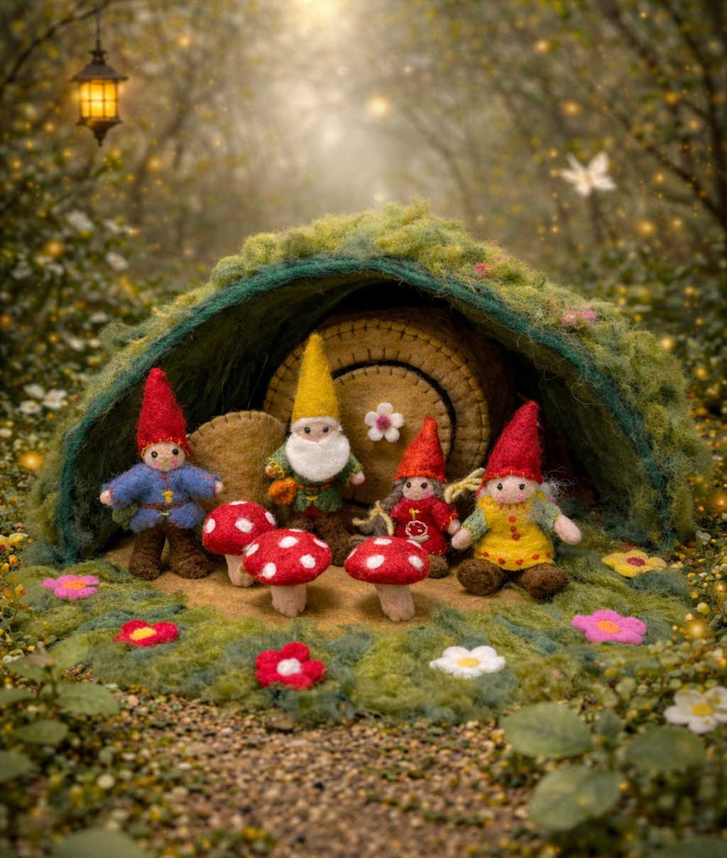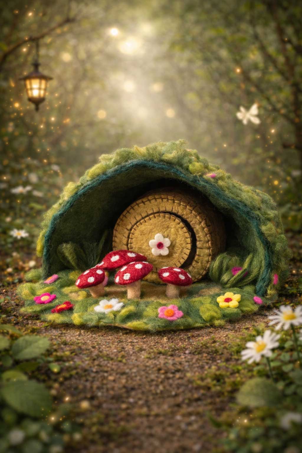 Felted fairy house with red mushrooms and flowers in a forest setting