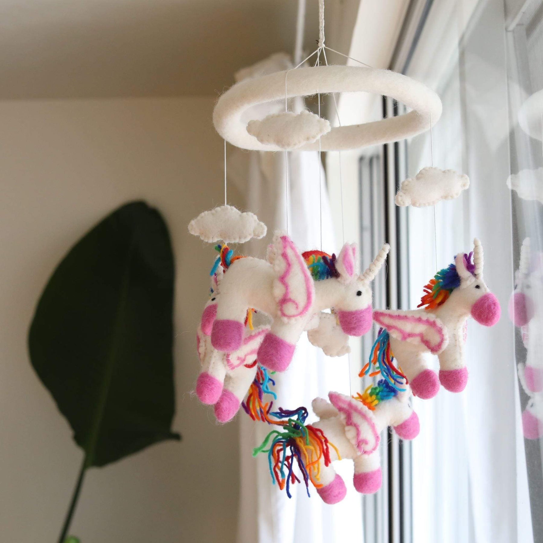 Our felt unicorn baby mobile is hand-made in Nepal of 100% New Zealand wool and uses Azo-free eco-friendly dyes. Each figure is needle felted individually and in 3D design, so they look great at any angle.
