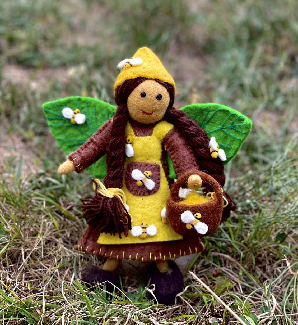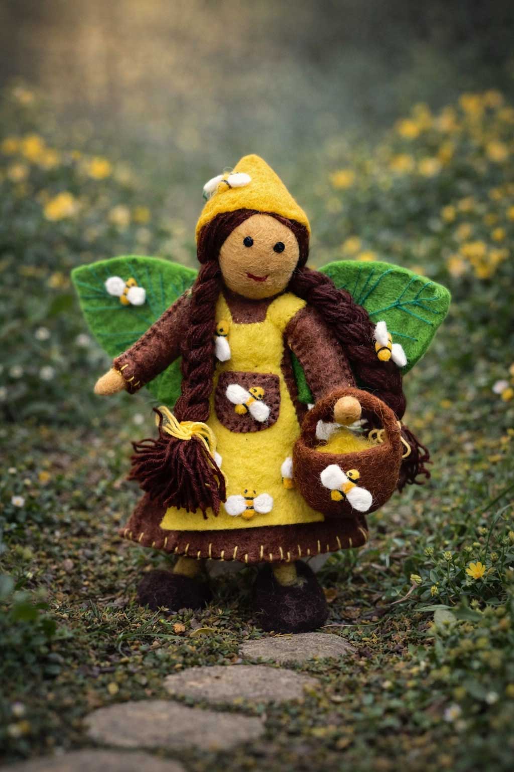 Mauri the Bee Fairy is the latest from the Himalayan Felt Co's Forest fairy range. She comes with a lovely story about the forest faeries and her own magical basket filled with bees.