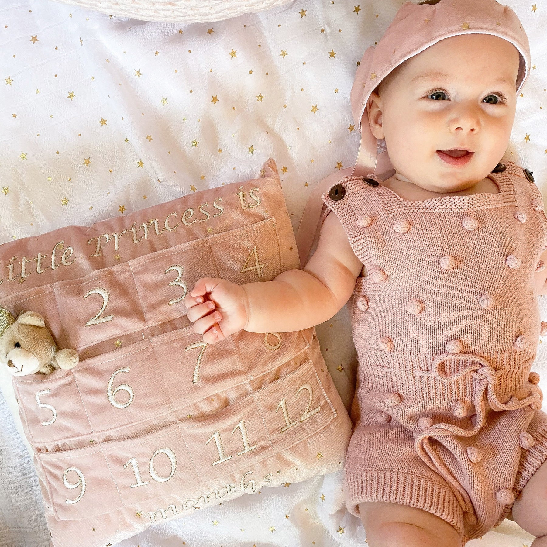 What a perfect way to photograph your baby at every stage of their sweet life. This monthly pillow comes with a beautifully crafted velvet crown with soft satin ribbon. Little Princess and Prince Bear velour finger puppet fits snuggly in the pockets numbered 1 - 12, to represent each month of babies first year. Pillow and crown are made with a beautiful celestial foil printed velvet.
