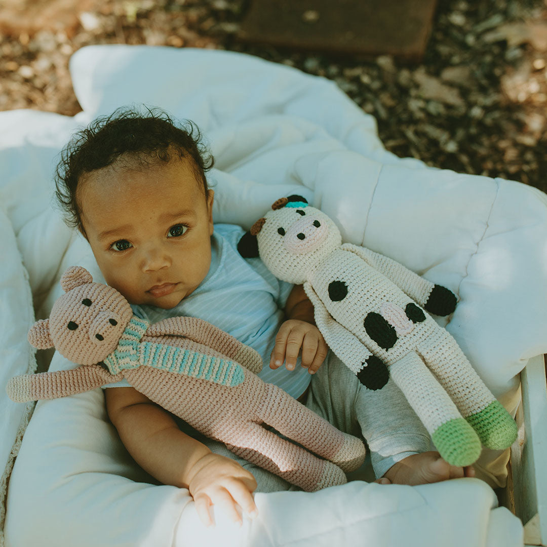Mooove on over and let the party begin! This baby cow toy has been planning hours of fun and can't wait to meet her new friend! Handmade with soft organic cotton yarn, this knit stuffed cow is super cuddly and sure to become a favorite.