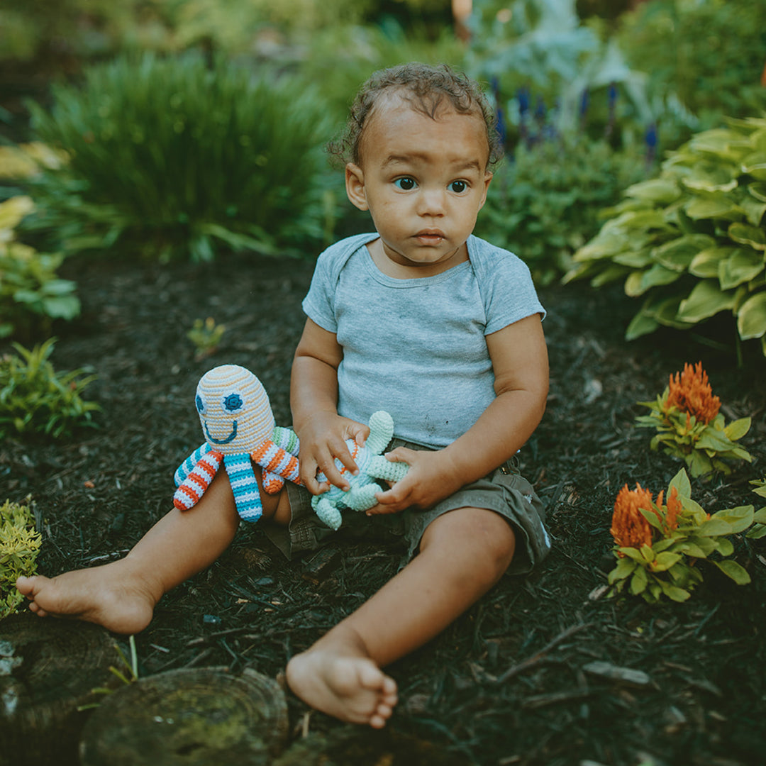 This happy little sea creature is a little hands' favorite! Our baby octopus rattle is colorful and full of personality. Handmade with lightweight cotton yarn, its soft rattle when shaken is sure to bring endless laughter and joy to your little one.