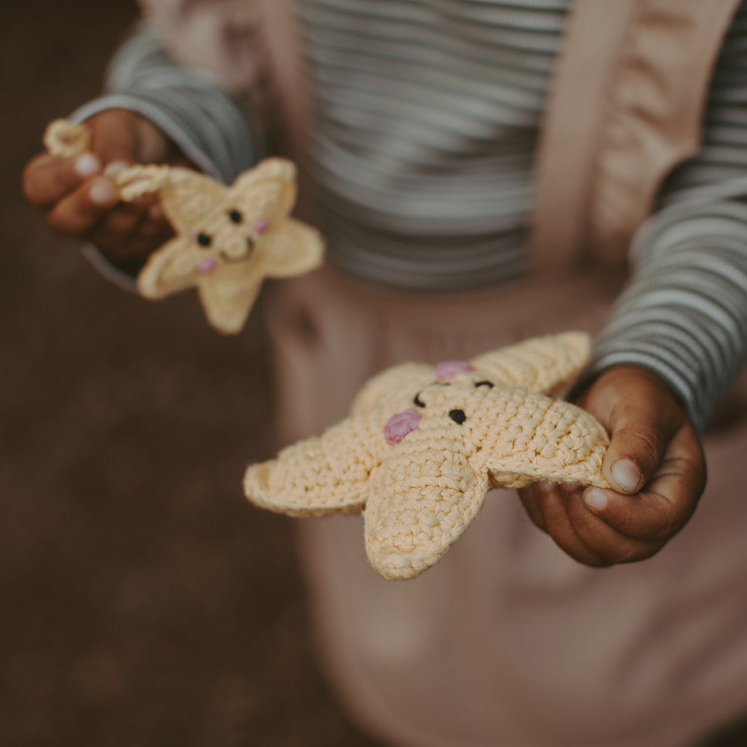 This sweet little Star Holiday ornament pairs well with our Star Rattle. Pebble ornaments are handmade with soft cotton yarn and stitched carefully with love. Designed with baby's safety in mind, these ornaments are non-toxic and soft, with no removable parts.