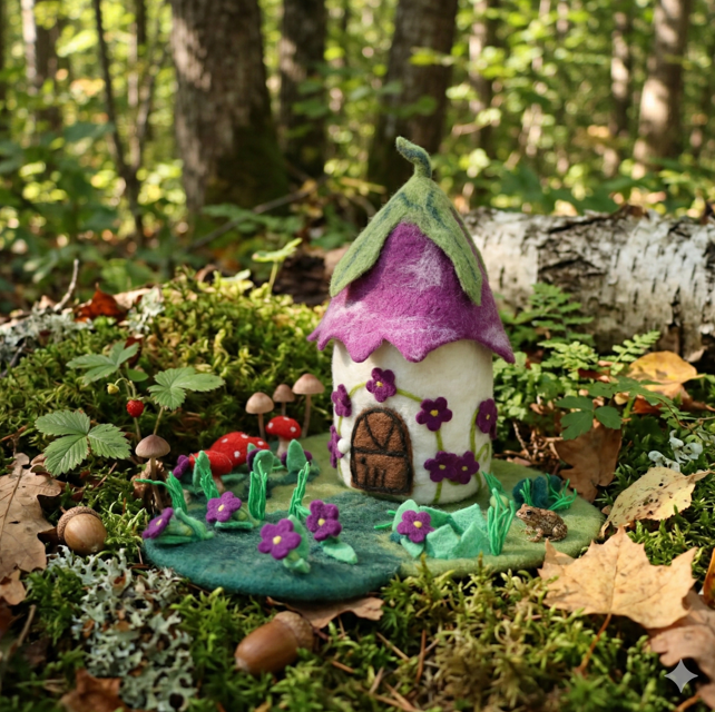 Promote imaginative play with the Blossom House! Made entirely from colorful felt from Nepalese female artisans, this whimsical house is a delightful new home for your favorite Ambrosius fairies. The blossom house comes with a front door that opens and a removable blossom roof that doubles as a hat! House is fixed onto a felted flowery garden mat with toadstools, flowers, and a small pond.