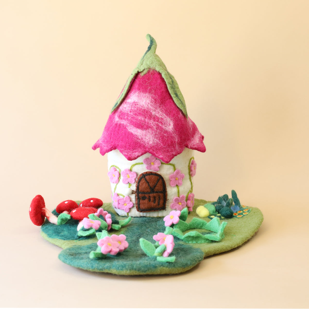 Promote imaginative play with the Blossom House! Made entirely from colorful felt from Nepalese female artisans, this whimsical house is a delightful new home for your favoriteĀ Ambrosius fairies. The pink blossom house comes with a front door that opens and a removable blossom roof! House is fixed onto a felted flowery garden mat with toadstools, flowers, and a small pond.Ā