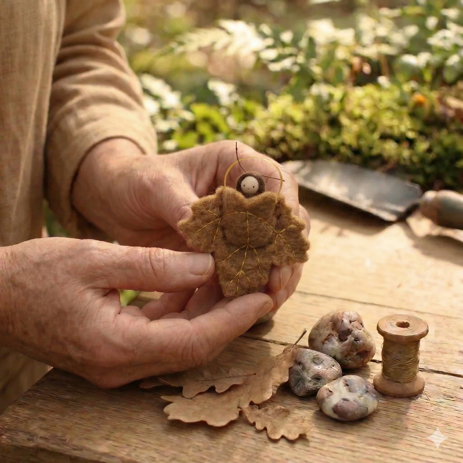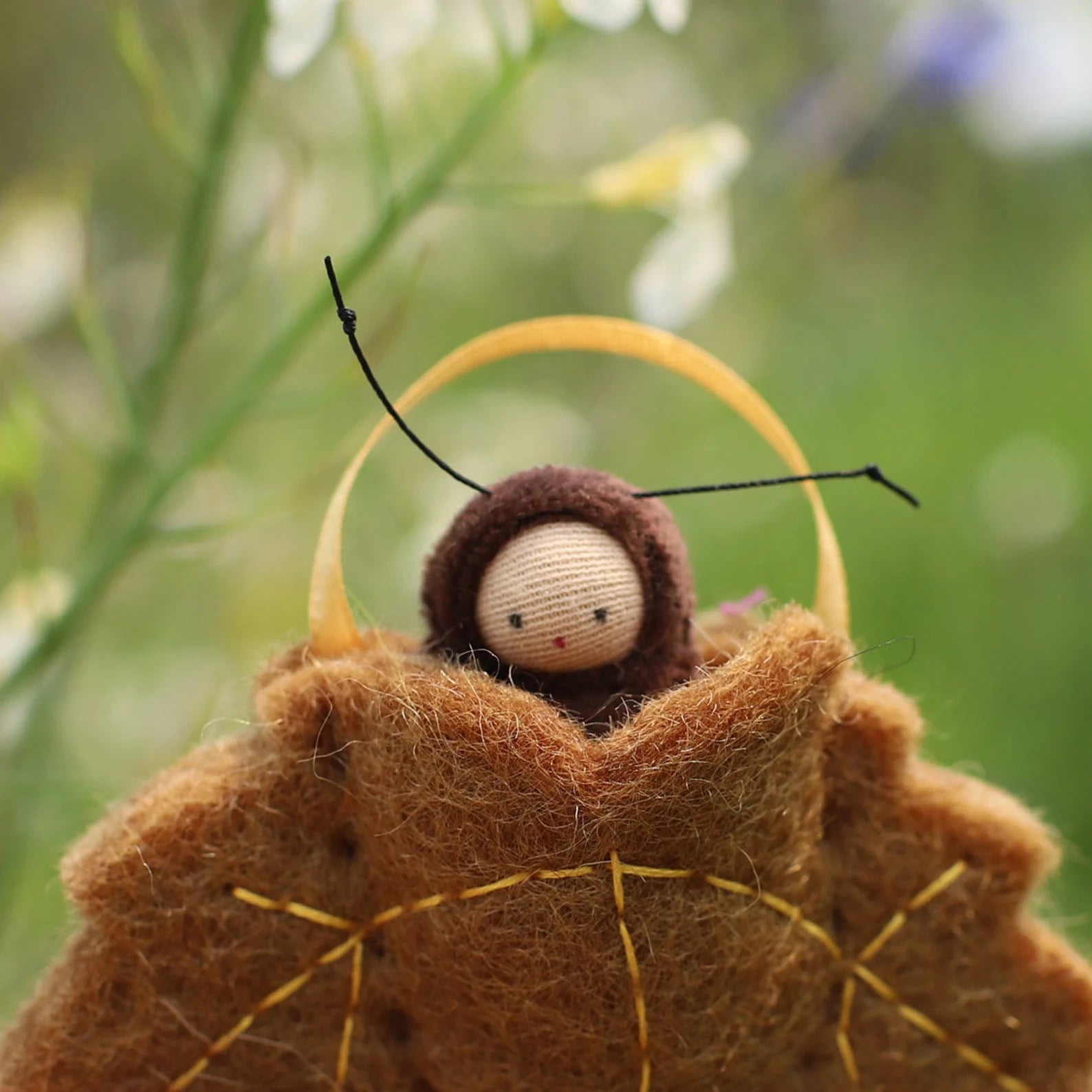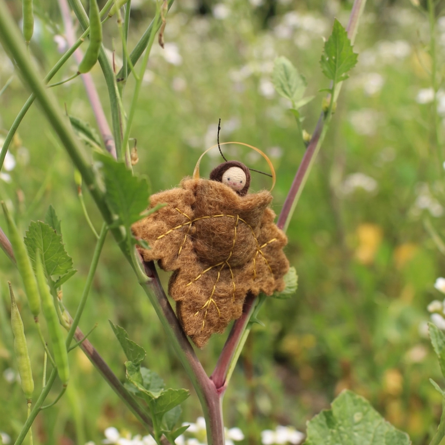 A hand embroidered brown leaf ornament with a pocket for a little removable 1-1/2" waldorf caterpillar doll. The leaf is 3" and 3" tall, it is made from thick 3mm wool felt. A sweet gift for baby's first Christmas or tuck the doll into an advent calendar and add the leaf to the tree.