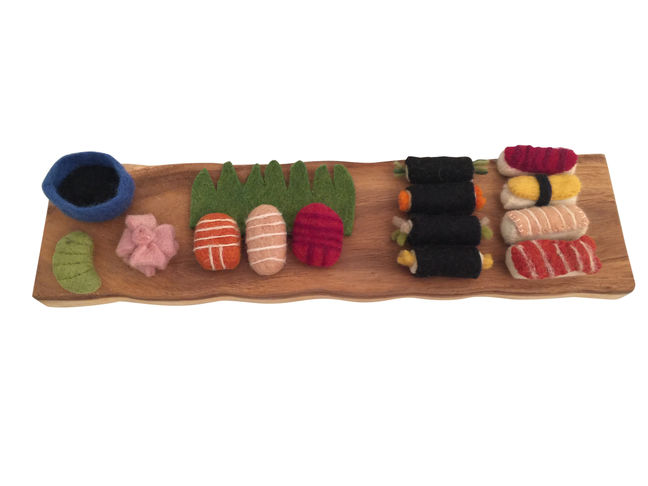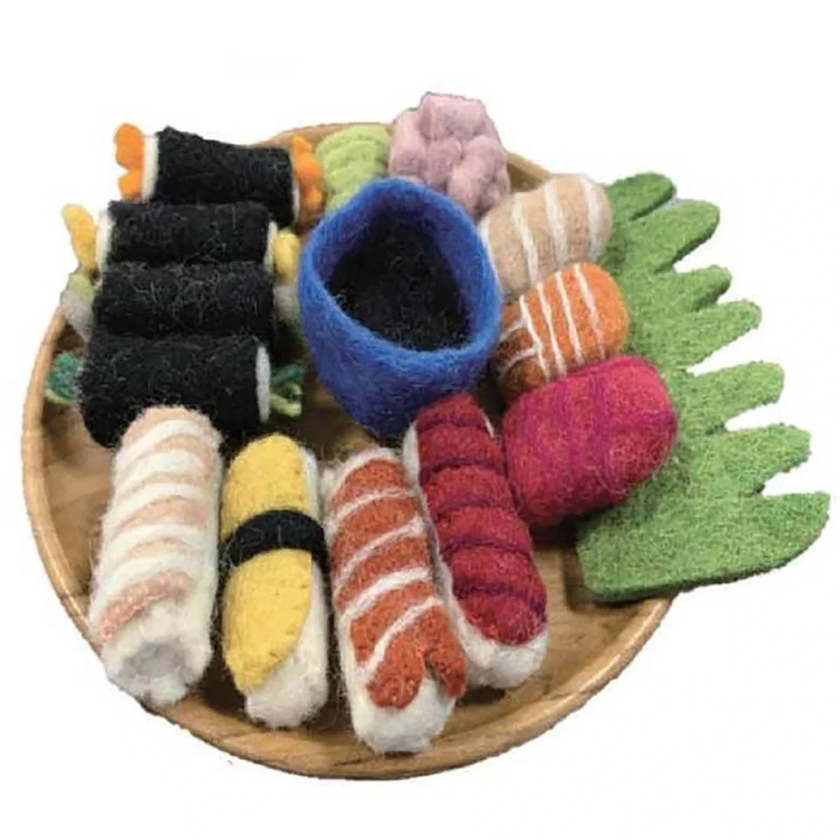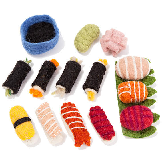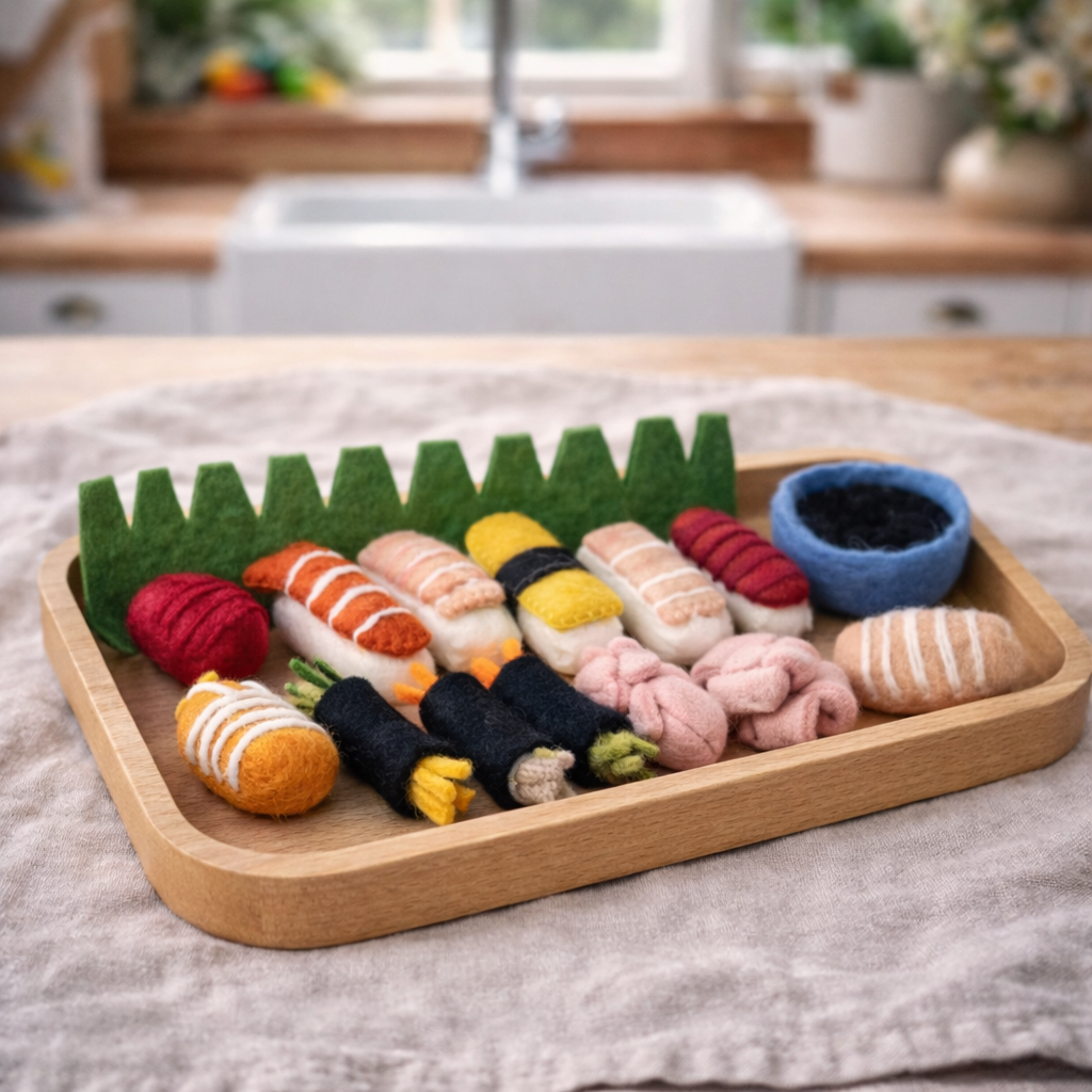 Lovingly made in Nepal by a skilled fair-trade cooperative, each piece is crafted from 100% natural felted wool using safe, eco-friendly materials. The set includes everything needed to create a realistic sushi experience — from sashimi and nigiri to maki rolls, complete with soy sauce, wasabi, and ginger for authentic finishing touches.