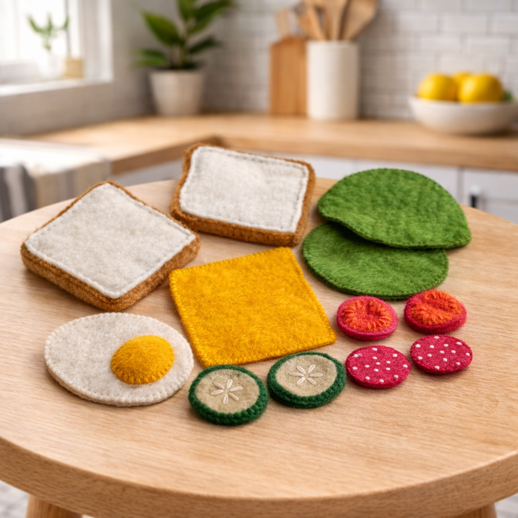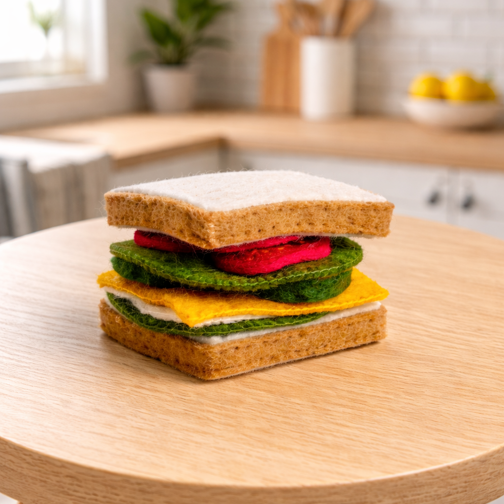 Nurture your little one’s creativity with the Papoose Felt Sandwich Set, a beautifully handcrafted 11-piece wool felt kit designed for open-ended play, role-play kitchens, restaurant scenes, and endless make-believe meals. Soft, tactile, and irresistibly charming, this set allows children to layer, stack, and assemble their own pretend sandwiches—building fine motor skills, language, and confidence along the way.