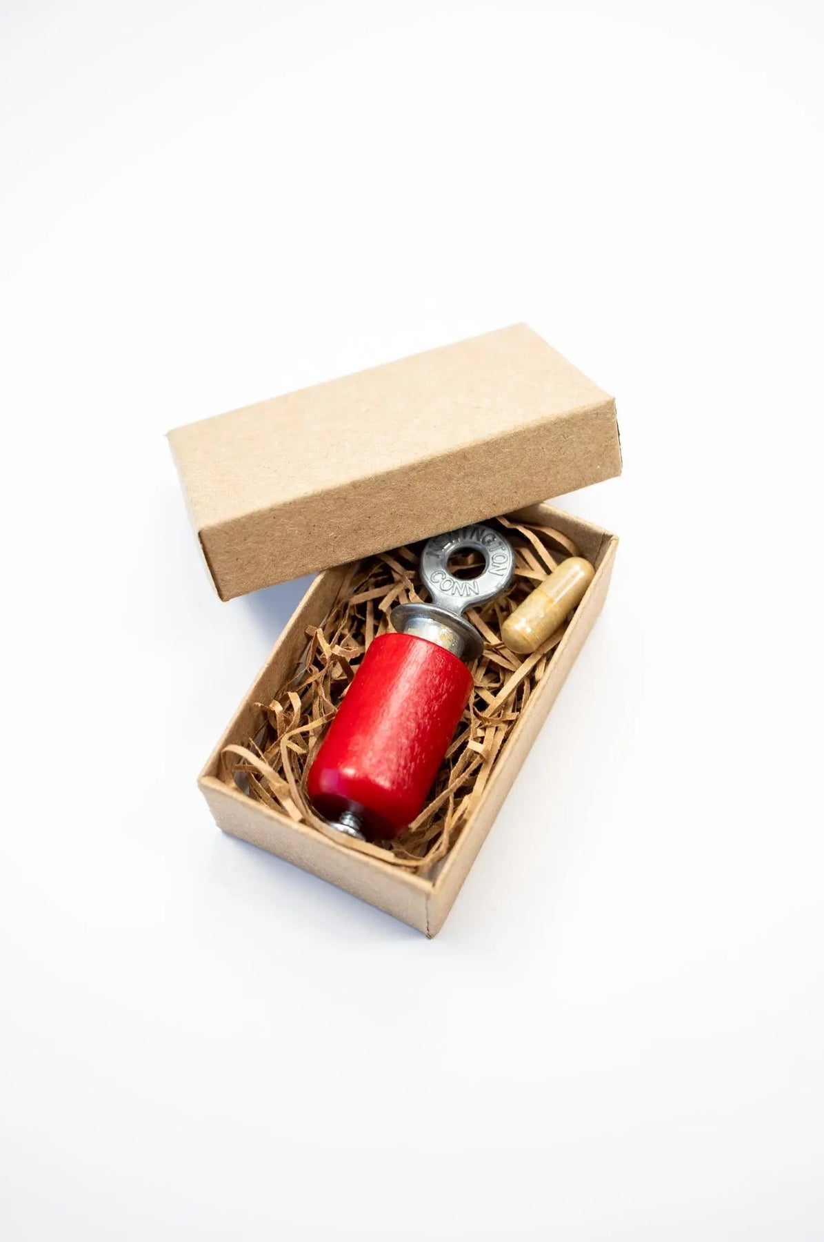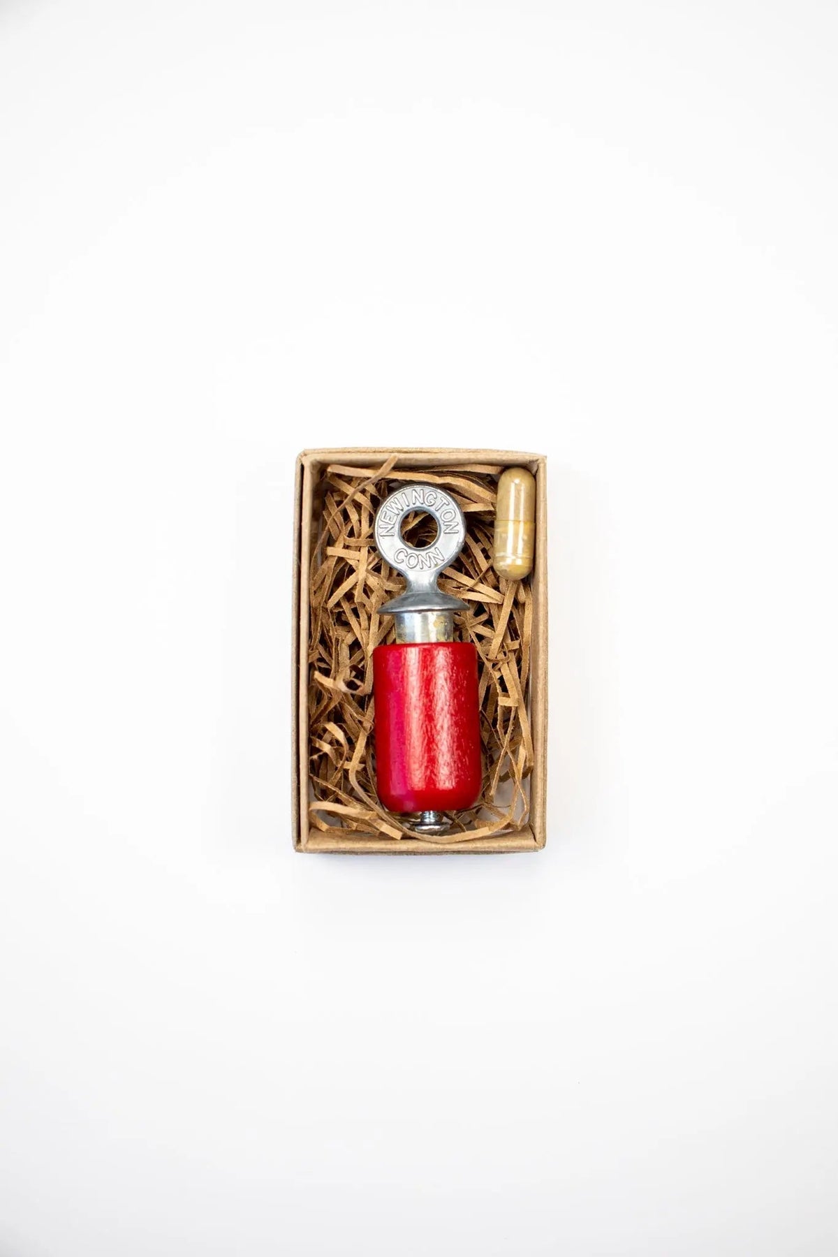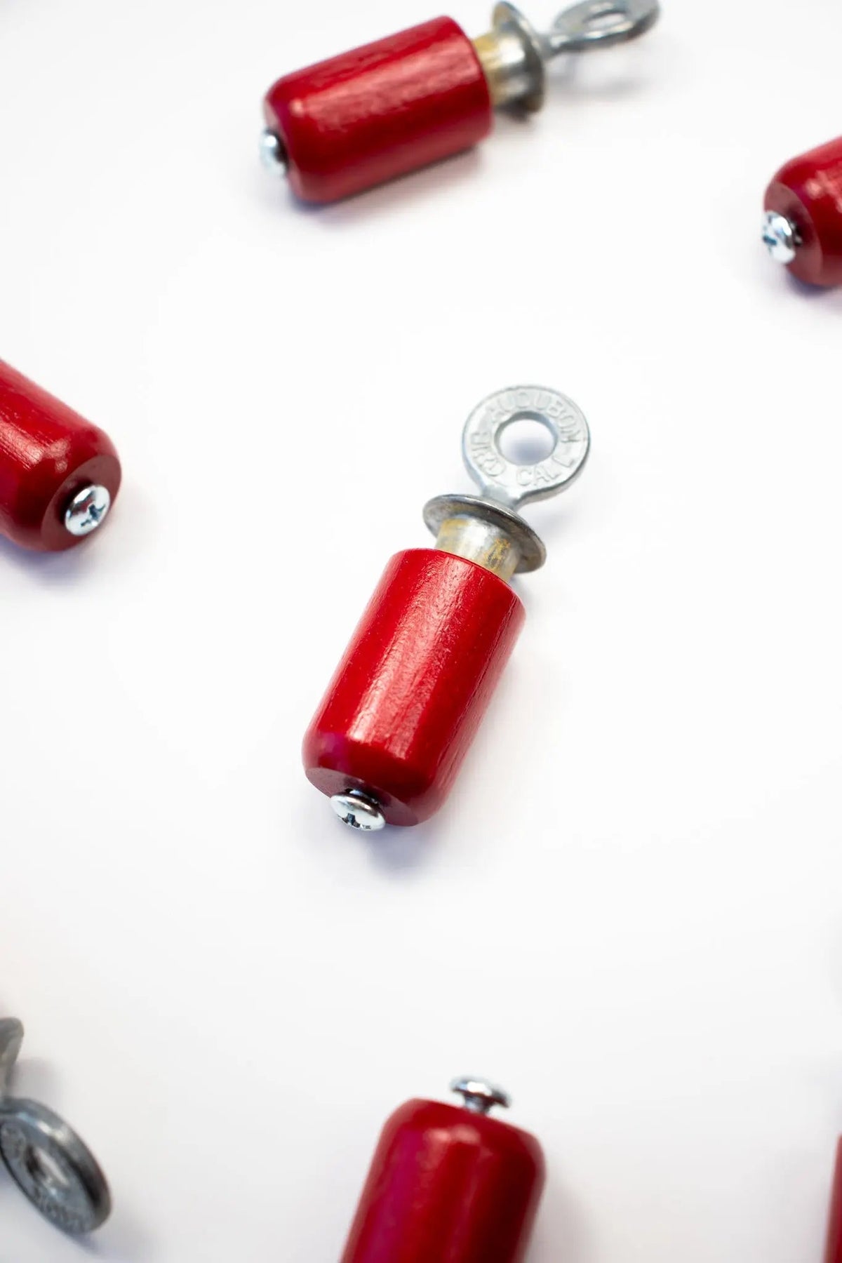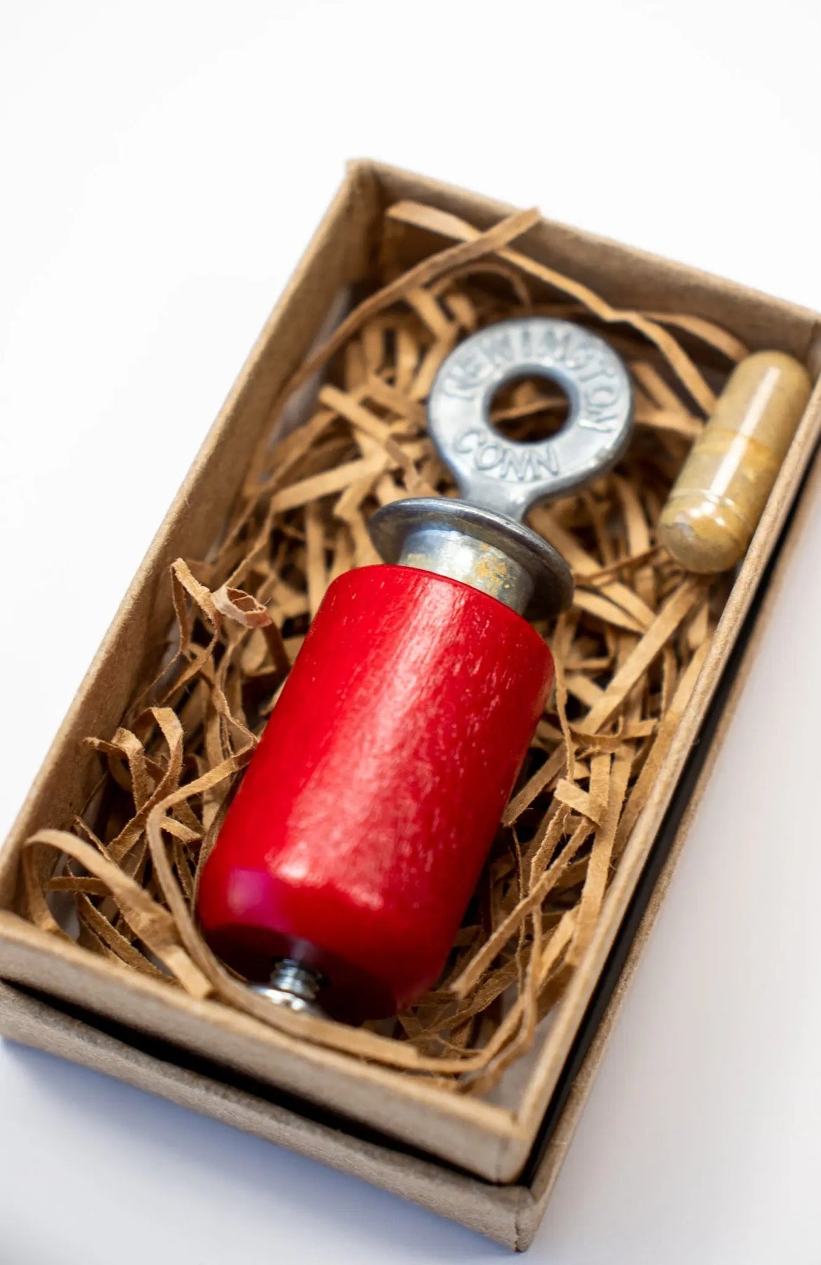 The bird call’s sound is produced by rotating the birchwood cylinder against the cast zinc plug. By varying the pressure between the two surfaces while twisting back and forth, a variety of bird sounds can be accurately imitated.