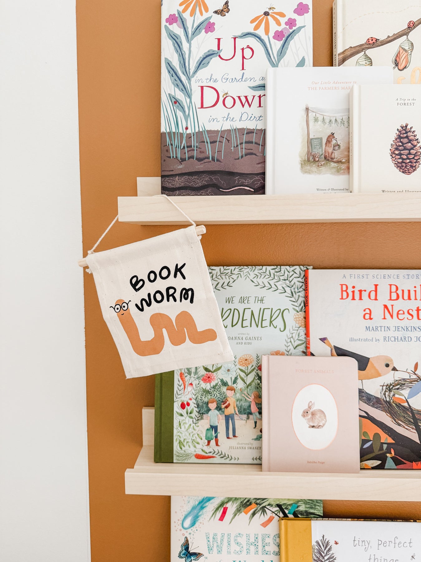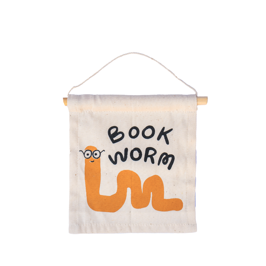 the bloom book worm hang sign on natural canvas with a poplar wooden dowel.