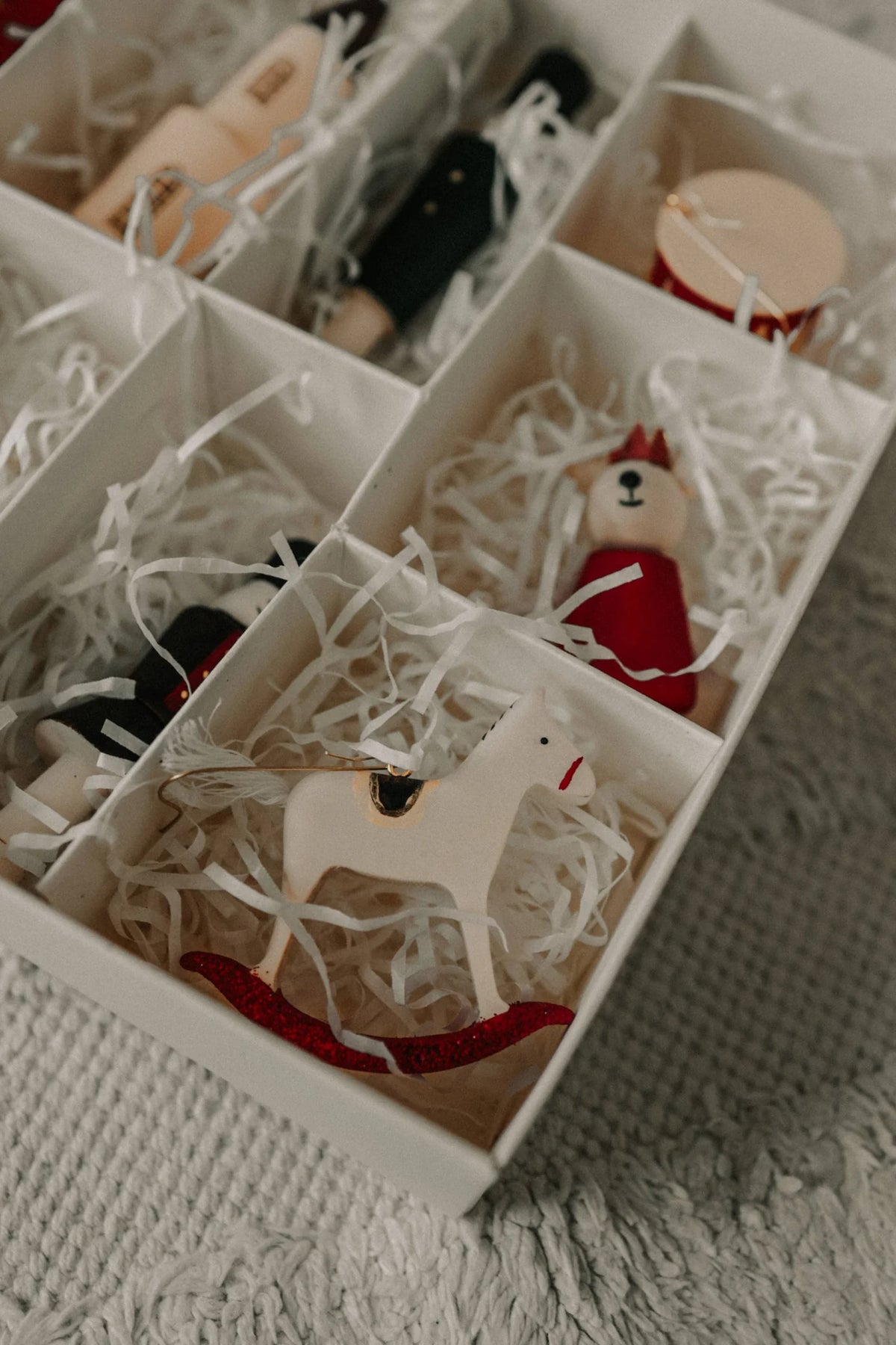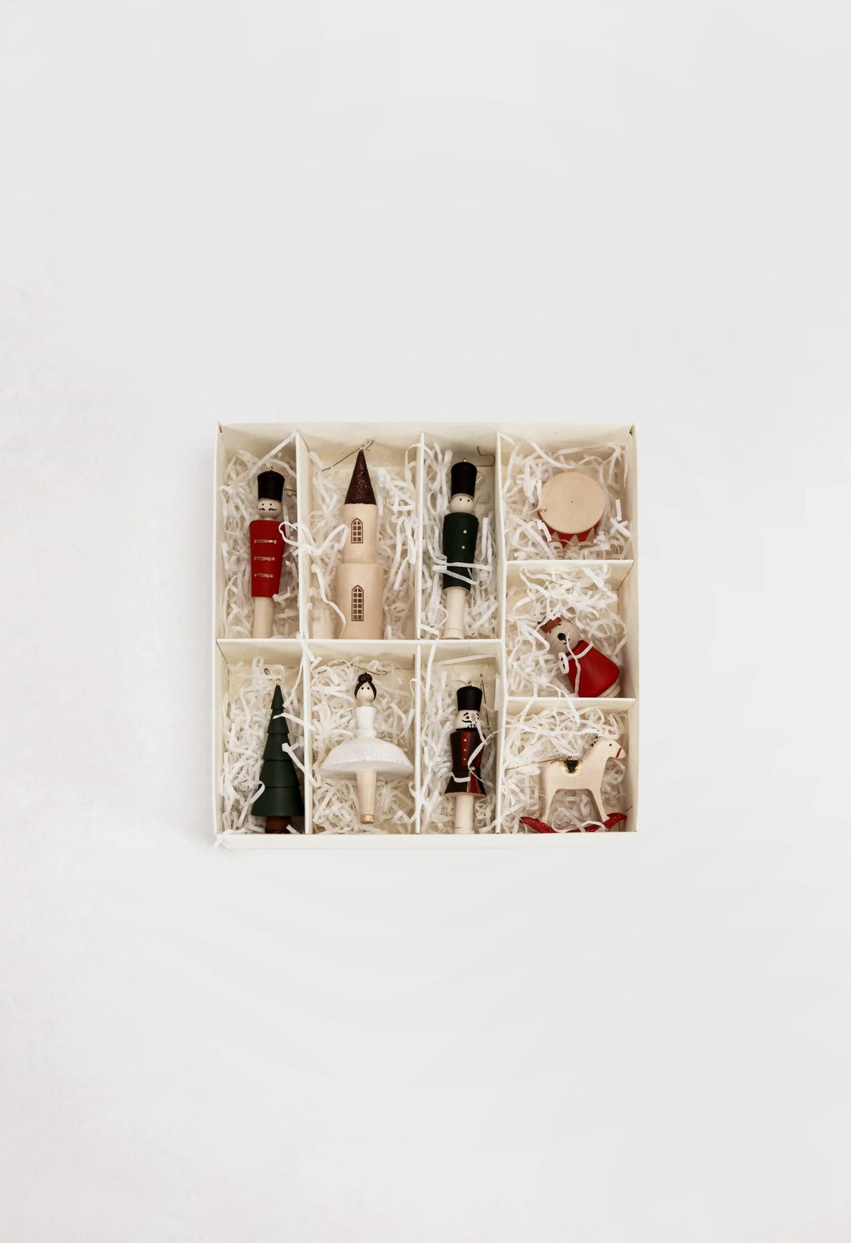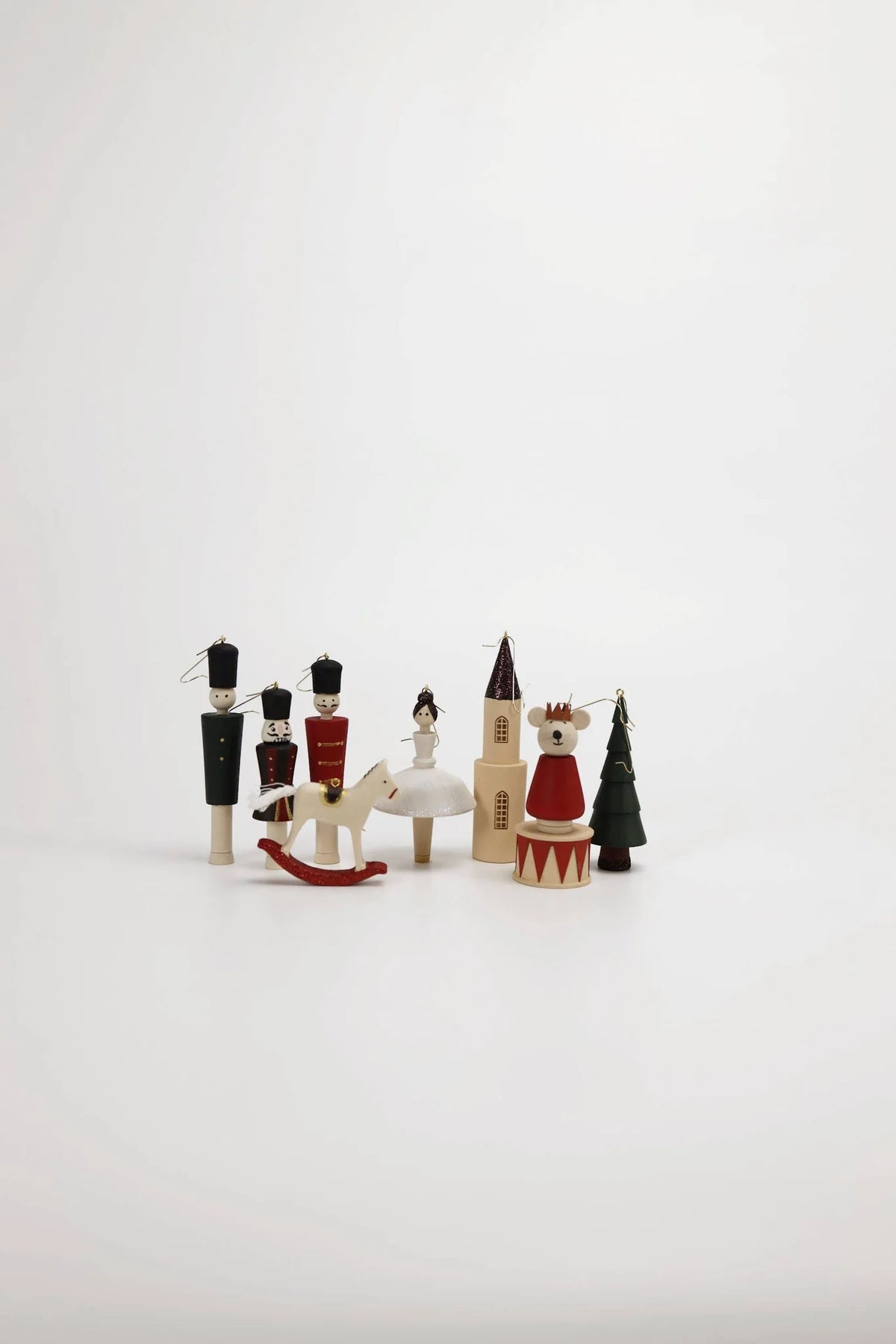 • Set of 9 hand-painted wooden ornaments: ballerina, nutcracker, red soldier, green soldier, mouse king, rocking horse, drum, Christmas tree, and tower