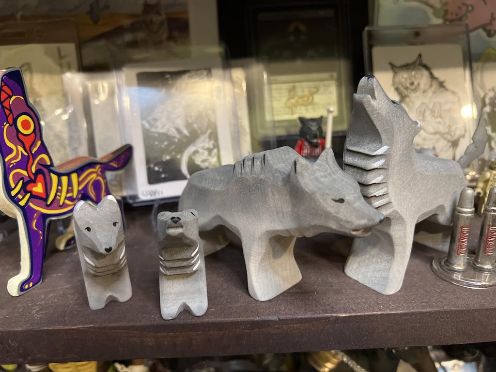This set features a collection of wooden wolf figurines, each hand-carved from sustainably sourced wood and finished with non-toxic, child-safe paints.