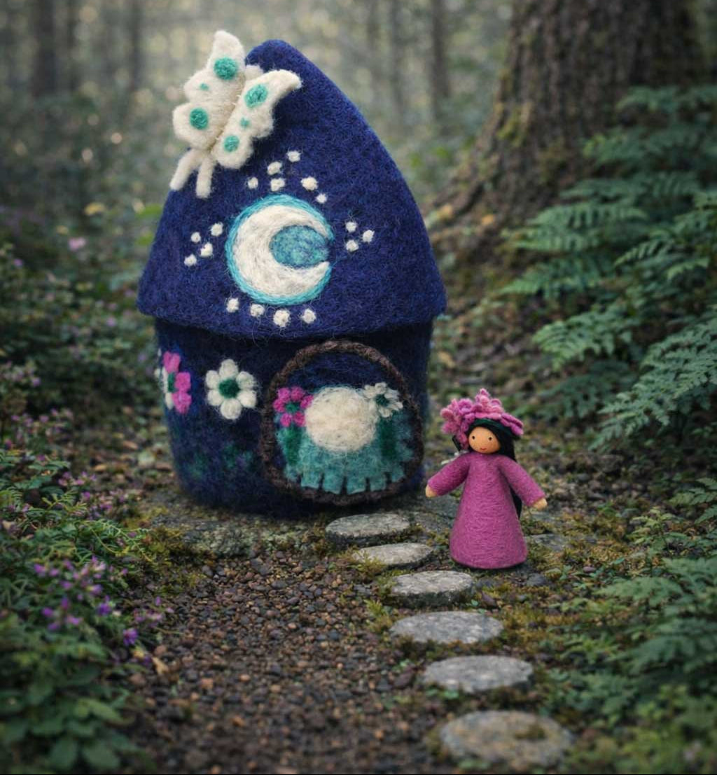 When the waxing moon rises in the sky, it's time for tired dancing feet to find a soft place to rest before the sun rises. This is the smaller size of the Luna faery homes, approx 10" high. Adorned with a beautiful crescent moon, a Luna butterfly, blooming moon flowers, a removable roof, and a door that opens and closes. It’s the perfect resting place for small faeries when playtime is over and a beautiful piece for encouraging open-ended play, language development, imagination and storytelling.