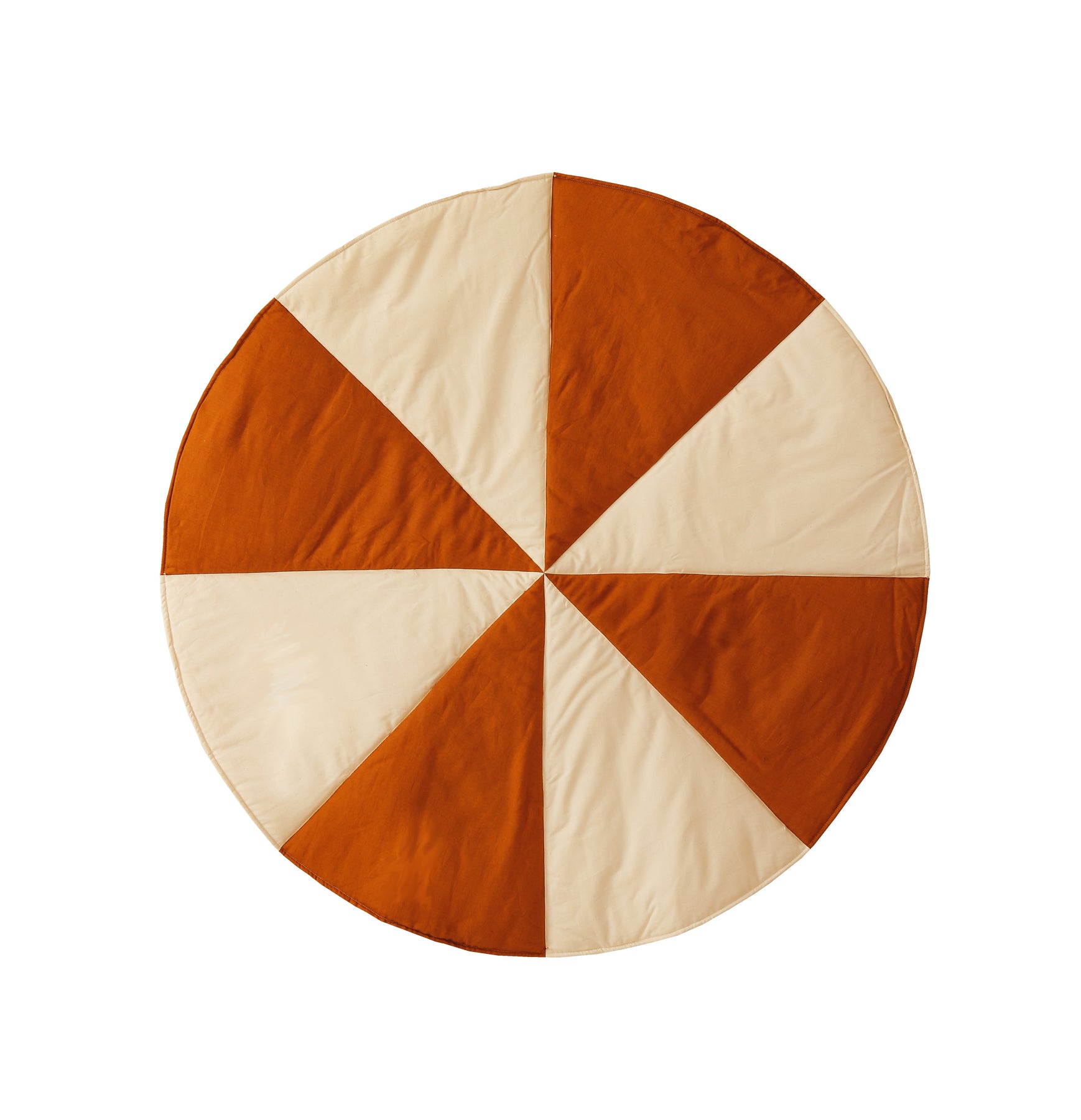 Our circus-inspired round mat made of linen and cotton is sewn firmly from caramel-colored linen and thick natural cotton. Durable and double-sided, it is filled with a thick insulation lining.