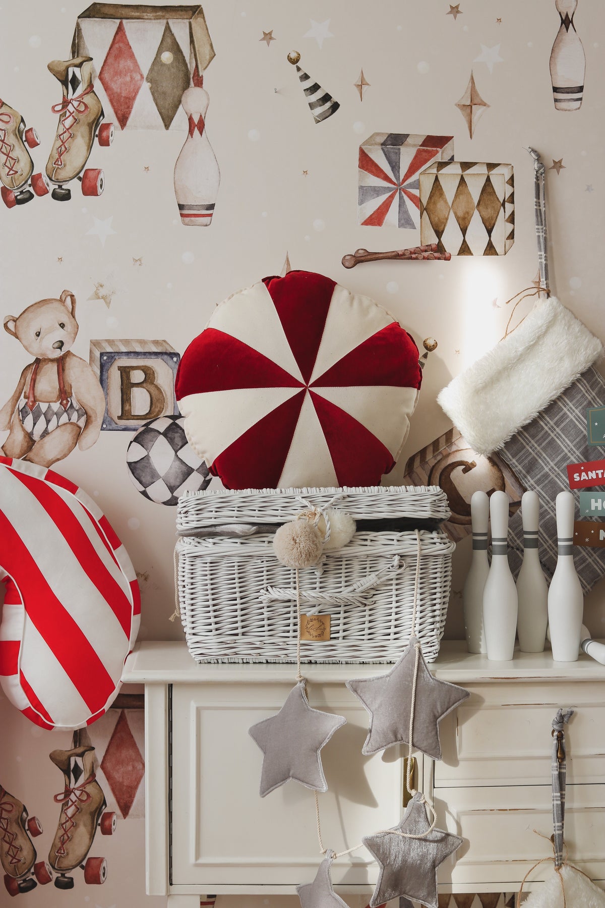 This fluffy cushion is sewn firmly from high-quality red velour and thick natural beige cotton.