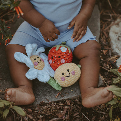 Bright and sweet, this plush Strawberry toy is ready to join all the other friendly fruits and vegetables. The rattle inside gives a soft jingle when shaken. Perfect for hours of imaginative play. Makes a fantastic addition to baby's 1st kitchen.